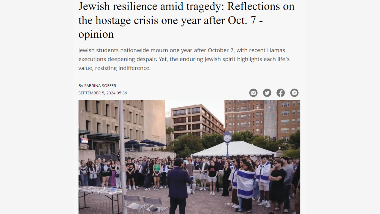 Sabrina Soffer, a Jewish Diplomatic Corps Academy member, writes an article for the Jerusalem Post reflecting on the hostage crisis one year after October 7.