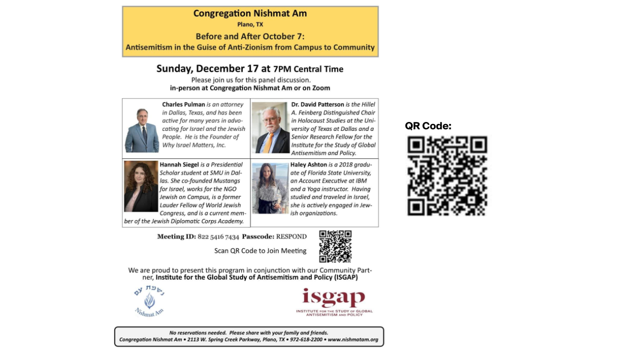Hannah Siegel, JD Academy Member (US), will be speaking at Congregation Nishmat Am in Plano, TX on December 17. You can access the webinar via the QR code on the flier.