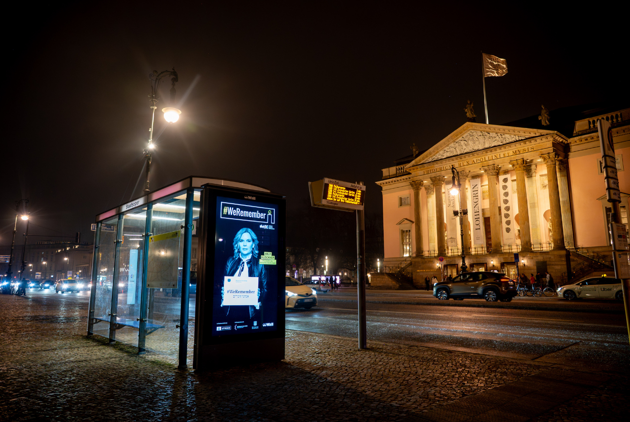 In Germany, hundreds of bus stops displayed powerful images of Holocaust survivors alongside prominent public figures, all holding signs bearing the hashtag #WeRemember, bringing the message of remembrance into everyday public spaces.